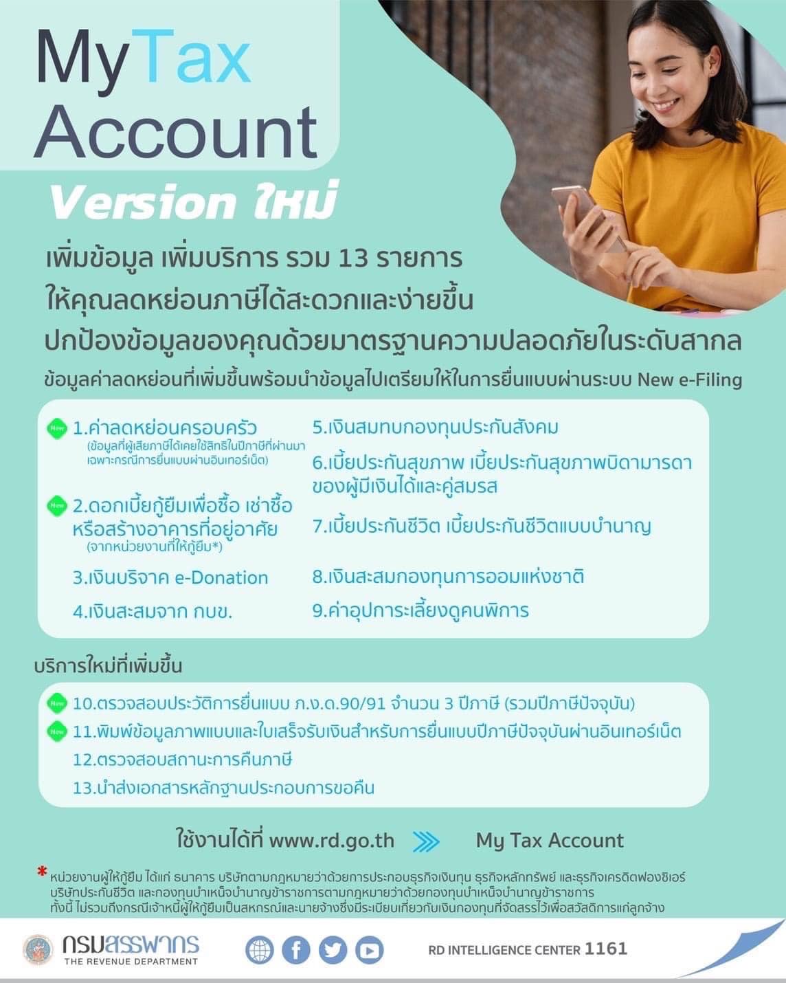 กรมสรรพากรได้พัฒนาระบบ My Tax Account ให้ดียิ่งขึ้นโดยเพิ่มข้อมูลค่าลดหย่อนและเพิ่มบริการ รวม 13 รายการ นอกจากนี้ยังได้เพิ่มข้อมูลเงินเดือนที่นายจ้างนำส่งให้กรมสรรพากรผ่านทางอิเล็กทรอนิกส์ เพื่ออำนวยความสะดวกให้ผู้เสียภาษีที่ต้องการเข้าถึงข้อมูลรายการค่าลดหย่อน และเงินเดือนด้วยตนเองโดยไม่ต้องกังวลเรื่องการเก็บเอกสารหลักฐาน มาพร้อมระบบความปลอดภัยที่ช่วยปกป้องข้อมูลด้วยมาตรฐานระดับสากล