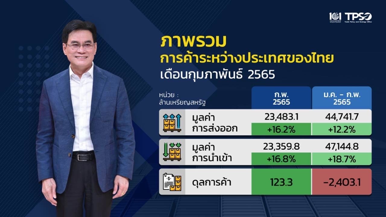 กระทรวงพาณิชย์ เผย เศรษฐกิจโลกฟื้น ส่งออกก.พ. ขยายตัว 16.2% ขณะ 2 เดือน โต 12.2% สงครามรัสเซีย ยูเครนยังไม่มีผล