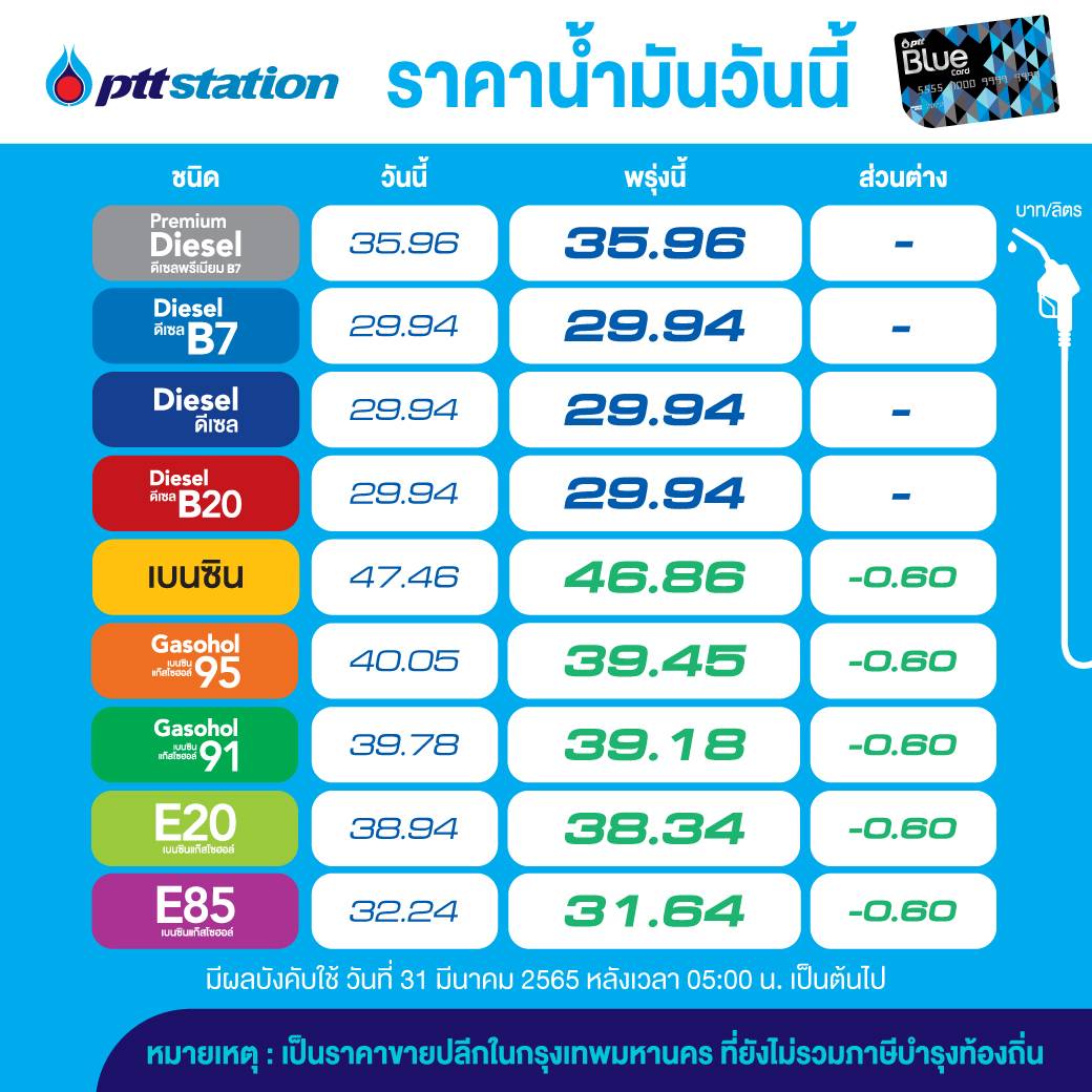 บมจ.ปตท.น้ำมันและการค้าปลีก (OR) และ บมจ.บางจาก คอร์ปอเรชั่น (BCP) ประกาศปรับลดราคาขายปลีกน้ำมันกลุ่มเบนซินและแก๊สโซฮอล์ทุกชนิดลง 60 สต.ต่อลิตร ส่วนกลุ่มดีเซลทุกชนิด คงเดิม มีผล 31 มี.ค.65 เวลา 05.00 น. เป็นต้นไป