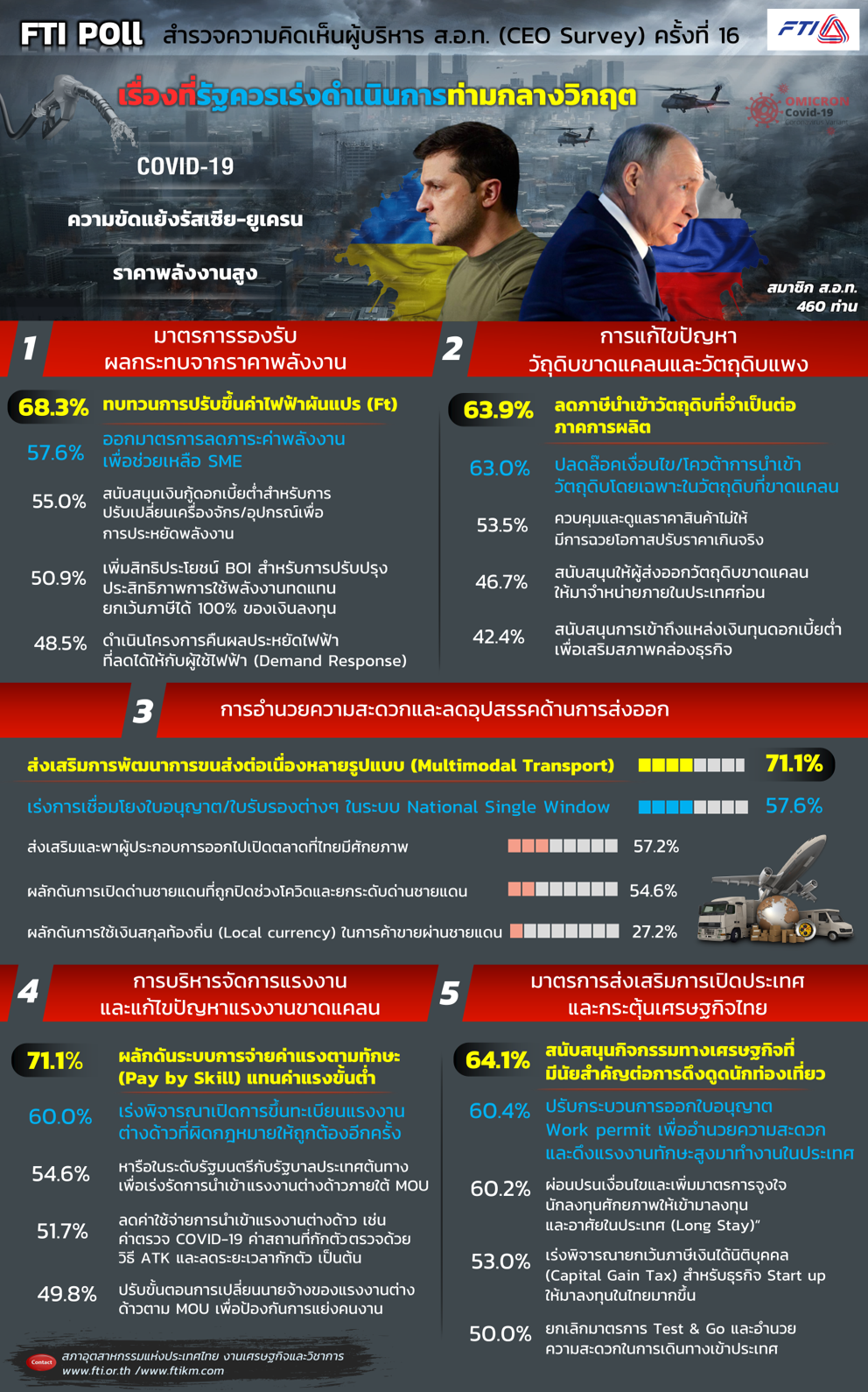 นายวิรัตน์ เอื้อนฤมิต รองประธานสภาอุตสาหกรรมแห่งประเทศไทย (ส.อ.ท.) เปิดเผยผลการสำรวจ FTI Poll ครั้งที่ 16 ในเดือนมีนาคม 2565 ภายใต้หัวข้อ “โพล ส.อ.ท. หนุนทบทวนปรับขึ้นค่า Ft” จากสมาชิก ส.อ.ท. ที่เข้าร่วมประชุมสามัญ ประจำปี 2565 เมื่อวันที่ 28 มีนาคม 2565 โดยสอบถามสมาชิกเกี่ยวกับข้อเสนอที่ภาครัฐควรเร่งดำเนินการใน 5 เรื่อง