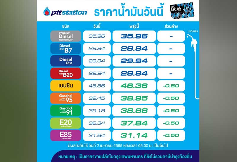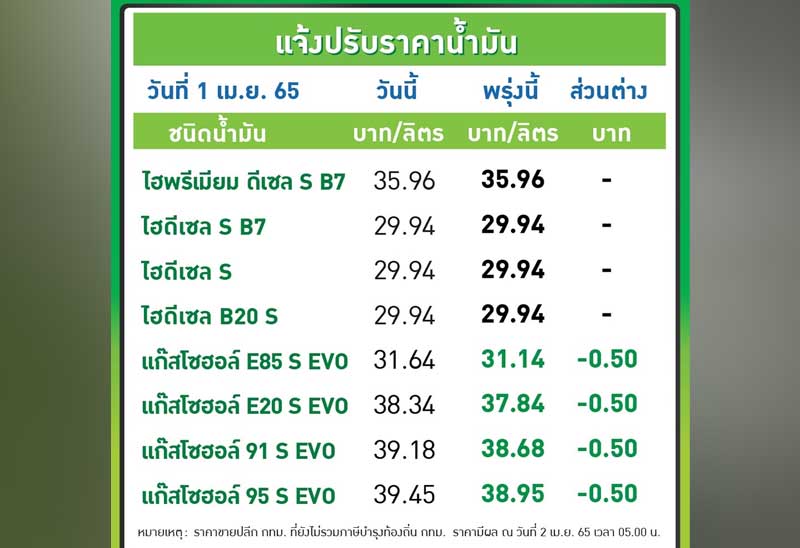 บมจ.ปตท.น้ำมันและการค้าปลีก (OR) และ บมจ.บางจาก คอร์ปอเรชั่น (BCP) ประกาศปรับลดราคาขายปลีกน้ำมันกลุ่มเบนซินและแก๊สโซฮอล์ทุกชนิดลง 50 สต.ต่อลิตร ส่วนกลุ่มดีเซลทุกชนิด คงเดิม มีผล 2 เม.ย.2565 ตั้งแต่เวลา 05.00 น. เป็นต้นไป