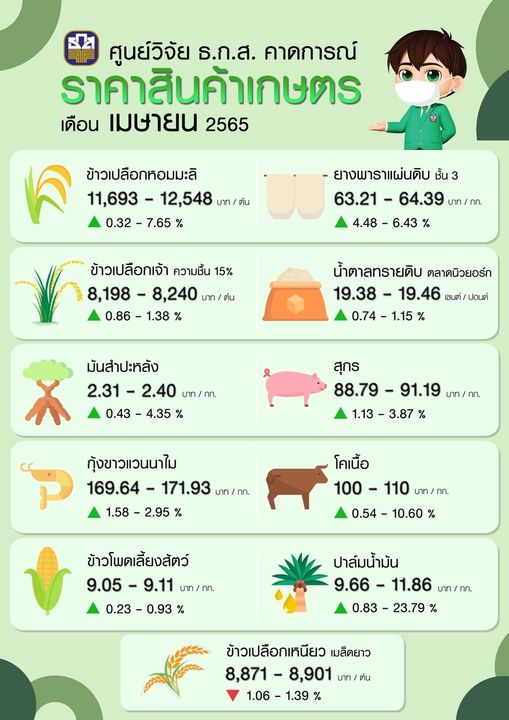 ศูนย์วิจัยและพัฒนานวัตกรรม ธ.ก.ส. เผย ในเดือนเม.ย. 2565 ราคาสินค้าส่วนใหญ่ปรับตัวสูงขึ้น เนื่องจากรัฐบาลเริ่มผ่อนคลายมาตรการควบคุมการแพร่ระบาดของโควิด-19 เพื่อกระตุ้นเศรษฐกิจในช่วงเทศกาลสงกรานต์และราคาน้ำมันดิบที่ยังเพิ่มสูงขึ้นจากความขัดแย้งระหว่างรัสเซียและยูเครน สินค้าที่มีแนวโน้มราคาสูงขึ้น ได้แก่ ข้าวเปลือกเจ้า น้ำตาลทรายดิบ มันสำปะหลัง ข้าวโพดเลี้ยงสัตว์ ปาล์มน้ำมัน ยางพาราดิบชั้น 3 กุ้งขาวแวนนาไม สุกร และโคเนื้อ ยกเว้นข้าวเปลือกเหนียวที่มีแนวโน้มราคาปรับลดลง