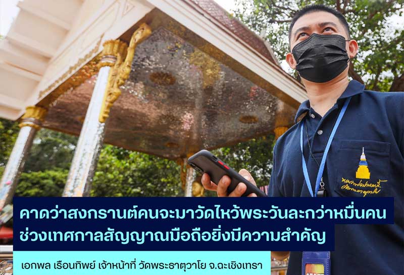 นายเอกพล เรือนทิพย์ เจ้าหน้าที่วัด วัดพระธาตุวาโย (วัดห้วยน้ำทรัพย์) จ.ฉะเชิงเทรา ให้ความเห็นว่าช่วงเทศกาลสงกรานต์จะมีคนมาวัดเพื่อไหว้พระทำบุญเพิ่มขึ้นทุกปี โดยเริ่มจะหนาแน่นช่วง 11-17 เมษายน ปกติวันหยุดเสาร์-อาทิตย์จะมีคนเดินทางมาไหว้พระวันละกว่าหมื่นคน โดยคาดว่าวันหยุดยาวช่วงสงกรานต์โดยเฉพาะ 13-15 เมษายน จะมีคนมาไหว้พระขอพรเพิ่มขึ้นอีกมากกว่าวันหยุด พอคนมามากขึ้นสัญญาณการใช้งานมือถือจะยิ่งมีความสำคัญ ไม่ว่าจะใช้ในการติดต่อสื่อสาร โซเชียล หรือใช้แอปพลิเคชันต่างๆ ในการซื้อของ โอน จ่ายเงิน” วัดพระธาตุวาโยจะเป็นสถานที่อันซีนแห่งหนึ่งของ จ.ฉะเชิงเทรา
