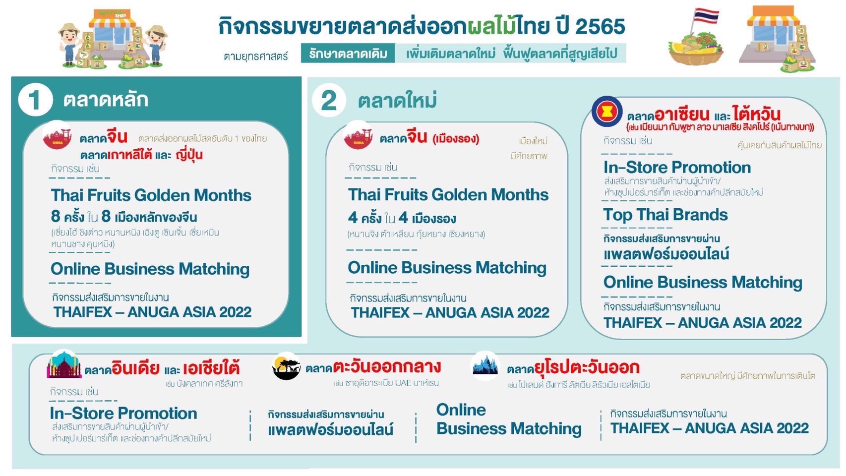 โดยผลผลิตผลไม้ปี 2565 จะมีปริมาณเพิ่มขึ้น ร้อยละ13 หรือ ประมาณ 5,426,555 ตัน ขายตลาดในประเทศร้อยละ 30 และตลาดต่างประเทศร้อยละ 70 โดยตลาดต่างประเทศนั้นกรมส่งเสริมการค้าระหว่างประเทศ จะขยายตลาดใหม่เพิ่มเติม รวมทั้งจะจัดกิจกรรมส่งเสริมการค้าผลไม้ตามด่านชายแดนอีกด้วย
