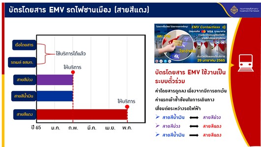 นายศักดิ์สยาม ชิดชอบ รัฐมนตรีว่าการกระทรวงคมนาคม (รวค.) เป็นประธานประชุมคณะกรรมการเตรียมการเปิดให้บริการและการบริหารโครงการระบบรถไฟชานเมือง (สายสีแดง) และสถานีกลางบางซื่อ เพื่อติดตามผลการดำเนินการด้านระบบตั๋วโดยสาร โดยปัจจุบันสามารถใช้บัตรโดยสาร EMV กับเรือโดยสาร รถเมล์ ขสมก. รถไฟฟ้าสายสีน้ำเงินและรถไฟฟ้าสายสีม่วงได้แล้ว ซึ่งจะมีการยกเว้นค่าแรกเข้าในการเดินทางเชื่อมต่อระหว่างรถไฟฟ้าสายสีน้ำเงิน สายสีม่วง และสายสีแดง เพื่อลดภาระค่าใช้จ่ายในการเดินทางของประชาชน และจะสามารถใช้กับ รถไฟฟ้าสายสีแดงได้ในเดือน พฤษภาคม 2565 นี้ โดยบัตรโดยสารรายเดือน 30 วัน 30 เที่ยว ราคา 750 บาท เฉลี่ย 25 บาทต่อเที่ยว เริ่มจำหน่ายตั้งแต่วันที่ 14 กุมภาพันธ์ 2565