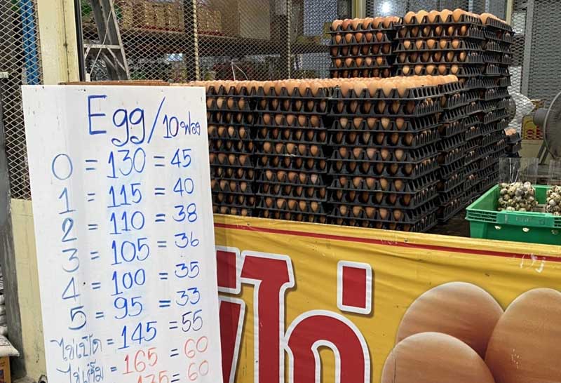 ส่วนราคาขายส่งแพ็คละ155-200บาทตามยี่ห้อเนื้อหมู กิโลกรัมละ 185-220บาท ตามชนิดของเนื้อ เช่น สะโพก สันใน-สันนอก สันคอ หมูสามชั้น ด้านไข่ไก่ ราคาขายอยู่ที่ แผงละ95-130 บาท ตามขนาดของไข่ไก่ เช่น เบอร์ 0 แผงละ 130 บาท เบอร์ 1 แผงละ 115 บาท เบอร์ 2 แผงละ110บาท เบอร์ 3 แผงละ105 บาท เบอร์4 แผงละ100 บาท เบอร์ 5 แผงละ 95บาท