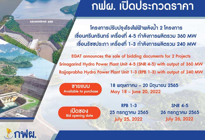 กำหนดขายเอกสารประกวดราคา ระหว่างวันที่ 18 พฤษภาคม – 20 มิถุนายน 2565 และเปิดซองประกวดราคาโครงการปรับปรุงโรงไฟฟ้าพลังน้ำเขื่อนรัชชประภา เครื่องที่ 1-3 ในวันที่ 25 กรกฎาคม 2565 และ โครงการปรับปรุงโรงไฟฟ้าพลังน้ำเขื่อนศรีนครินทร์ เครื่องที่ 4-5 ในวันที่ 26 กรกฎาคม 2565