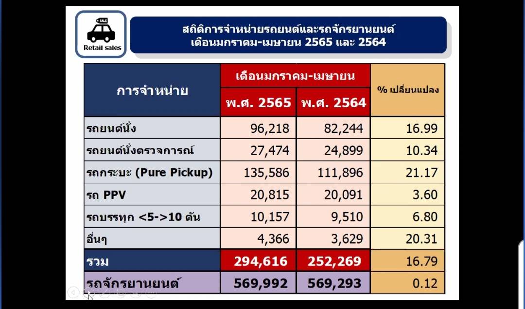 ในขณะที่ยอดขายรถยนต์ในประเทศช่วงเดือนเมษายนเพิ่มขึ้นร้อยละ 9.11 คิดเป็นจำนวน 63,427 คันและในช่วง 4 เดือนเพิ่มขึ้นร้อยละ 16.79 คิดเป็นจำนวน 294,616 คัน เนื่องจากในช่วงเวลาดังกล่าวประเทศมีการผ่อนคลายล็อกดาวน์ สามารถจัดกิจกรรมสงกรานต์ทำให้มีคนเดินทางจึงมีการเร่งส่งมอบรถยนต์มากขึ้น และการมีกิจกรรมทางเศรษฐกิจส่งผลทำให้ประชาชนมีรายได้เพิ่มขึ้นส่งผลกับการซื้อรถยนต์มากขึ้นด้วย เชื่อว่าจะทำให้ยอดขายเป็นไปตามเป้าหมายที่ 8.5 แสนคันหรืออาจทะลุถึง 9 แสนคันได้