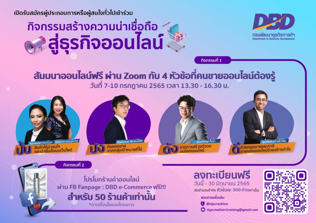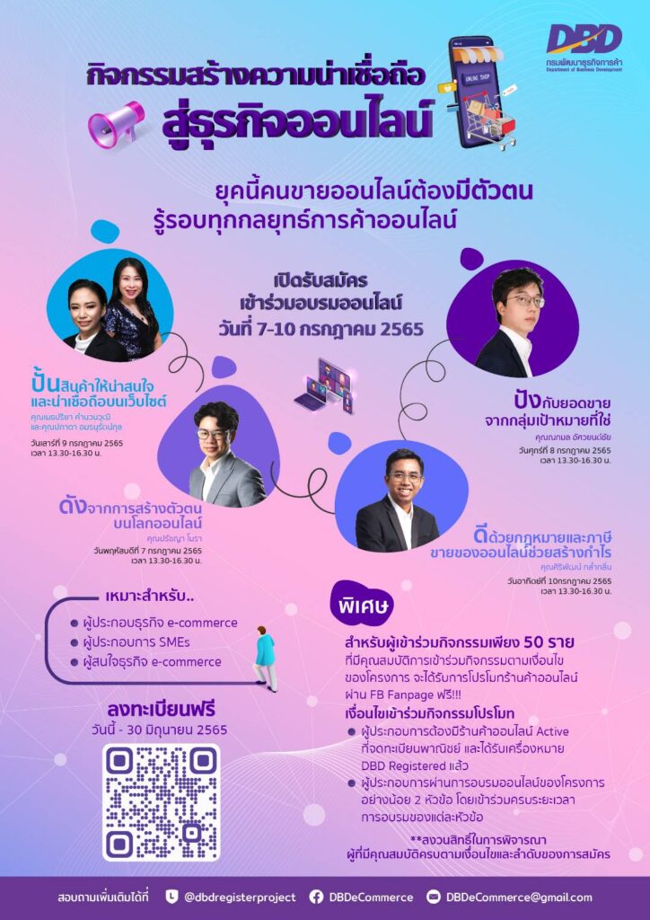 ดังจากการสร้างตัวตนบนโลกออนไลน์ และ ดีด้วยกฎหมายและภาษีขายของออนไลน์ช่วยสร้างกำไร เป็นการอบรมผ่านระบบออนไลน์ ระหว่างวันที่ 7-10 กรกฎาคม 2565 ผู้สนใจสมัครเข้าร่วมกิจกรรมฯ ได้ทาง www.dbd.go.th ตั้งแต่วันนี้ ถึง 30 มิถุนายน 2565 โดยไม่มีค่าใช้จ่ายใดๆ