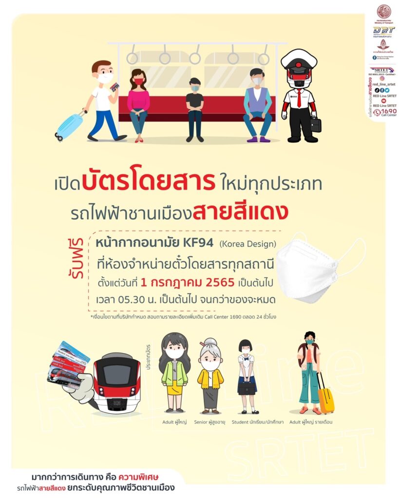 รถไฟฟ้าสายสีแดง ห่วงใยผู้โดยสาร ซื้อตั๋ว รับฟรีหน้ากากอนามัย KF94 ตั้งแต่วันที่ 1 กรกฎาคม 2565 เป็นต้นไป