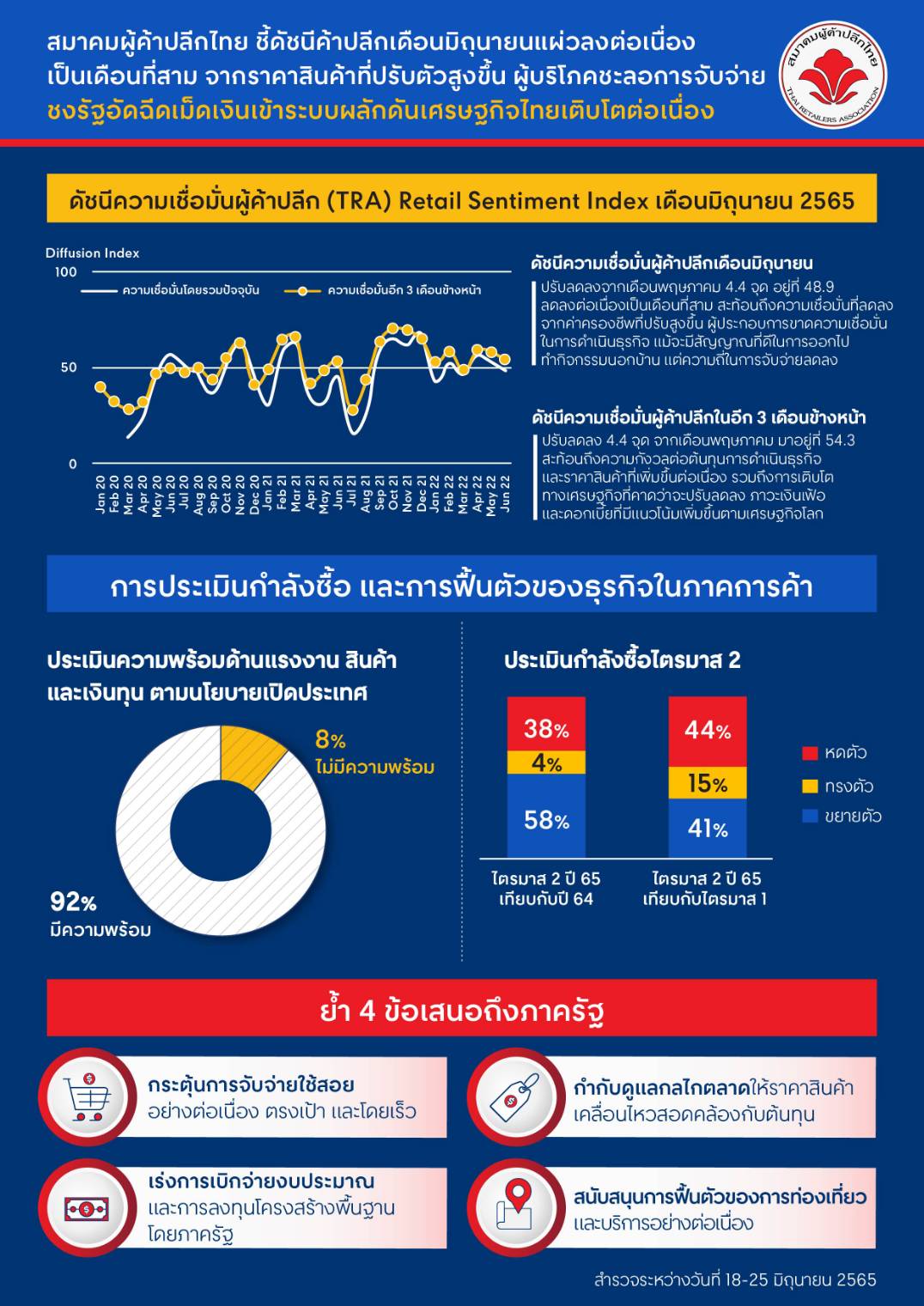 ซึ่งลดลงต่อเนื่องเป็นเดือนที่ 3 สะท้อนให้เห็นถึงความเชื่อมั่นที่ปรับตัวลดลงจากภาวะค่าครองชีพที่ปรับเพิ่มสูงขึ้นซ้ำเติมกำลังซื้อของผู้บริโภคที่ยังอ่อนแอ ผู้ประกอบการไม่มีความเชื่อมั่นในการดำเนินธุรกิจ แม้ว่ามีแนวโน้มสัญญาณที่ดีในการออกไปทำกิจกรรมทางเศรษฐกิจนอกบ้านเพิ่มมากขึ้น แต่ความถี่ในการจับจ่ายกลับลดลง