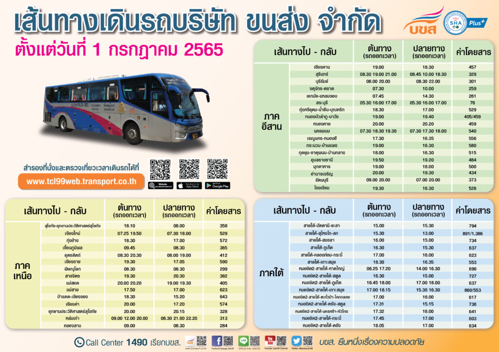 ขึ้นค่าโดยสารกิโลเมตรละ 5 สตางค์ ตั้งแต่วันที่ 4 กรกฎาคมที่ผ่านมา โดย บขส. จะตรึงราคาค่าโดยสารในอัตราเดิมไปจนถึงวันที่ 30 กันยายน 2565 เพื่อช่วยแบ่งเบาภาระค่าครองชีพให้กับประชาชน สอบถามข้อมูลการเดินทางเพิ่มเติมได้ที่ call center 1490 เรียก บขส. ตลอด 24 ชั่วโมง