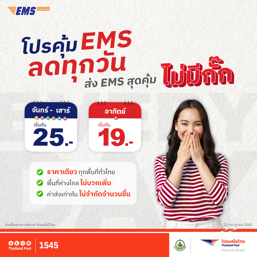 สำหรับส่วนลดค่าส่งด่วน “โปรคุ้ม EMS ลดทุกวัน” วันจันทร์ถึงวันเสาร์ค่าบริการเริ่มต้น 25 บาท พิเศษอาทิตย์ราคาเริ่มต้น 19 บาท ลดสูงสุดกว่า 50% ถึง 31 กรกฎาคม 2565 นี้ นอกจากนี้ ไปรษณีย์ไทยยังเตรียมเซอร์ไพรส์ค่าขนส่งที่ให้ประชาชนได้เฮกันอีกรอบในครึ่งปีหลังนี้อีกด้วย