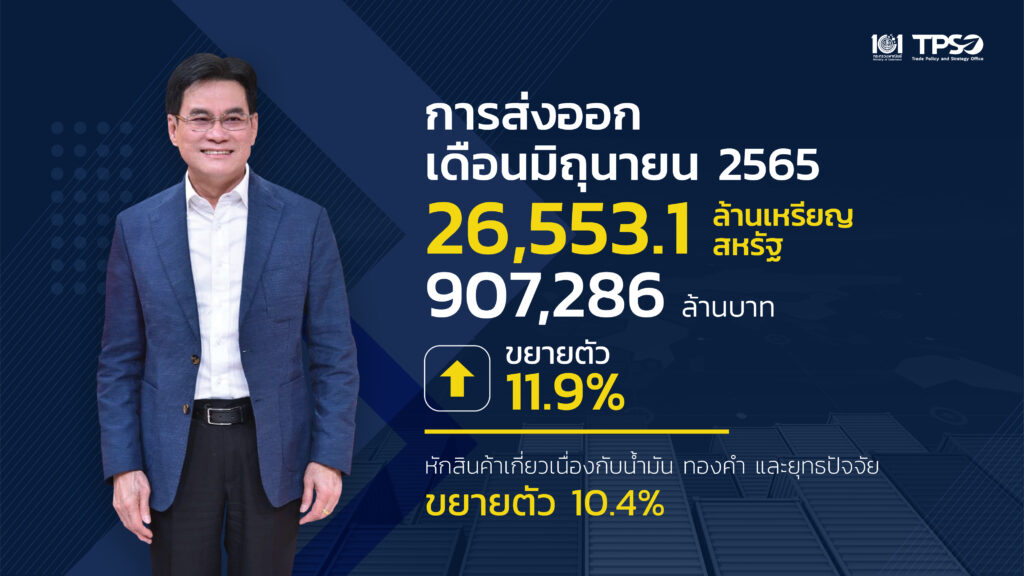 นายจุรินทร์ ลักษณวิศิษฐ์ รองนายกรัฐมนตรี และรัฐมนตรีว่าการกระทรวงพาณิชย์ เปิดเผยถึงสถิติการส่งออกของประเทศในช่วงเดือนมิถุนายน 2565 พบว่า การส่งออกขยายตัว ร้อยละ 11.9 คิดเป็นมูลค่ากว่า 26,553 ล้านเหรียญสหรัฐ (9.07แสนลบ.)
