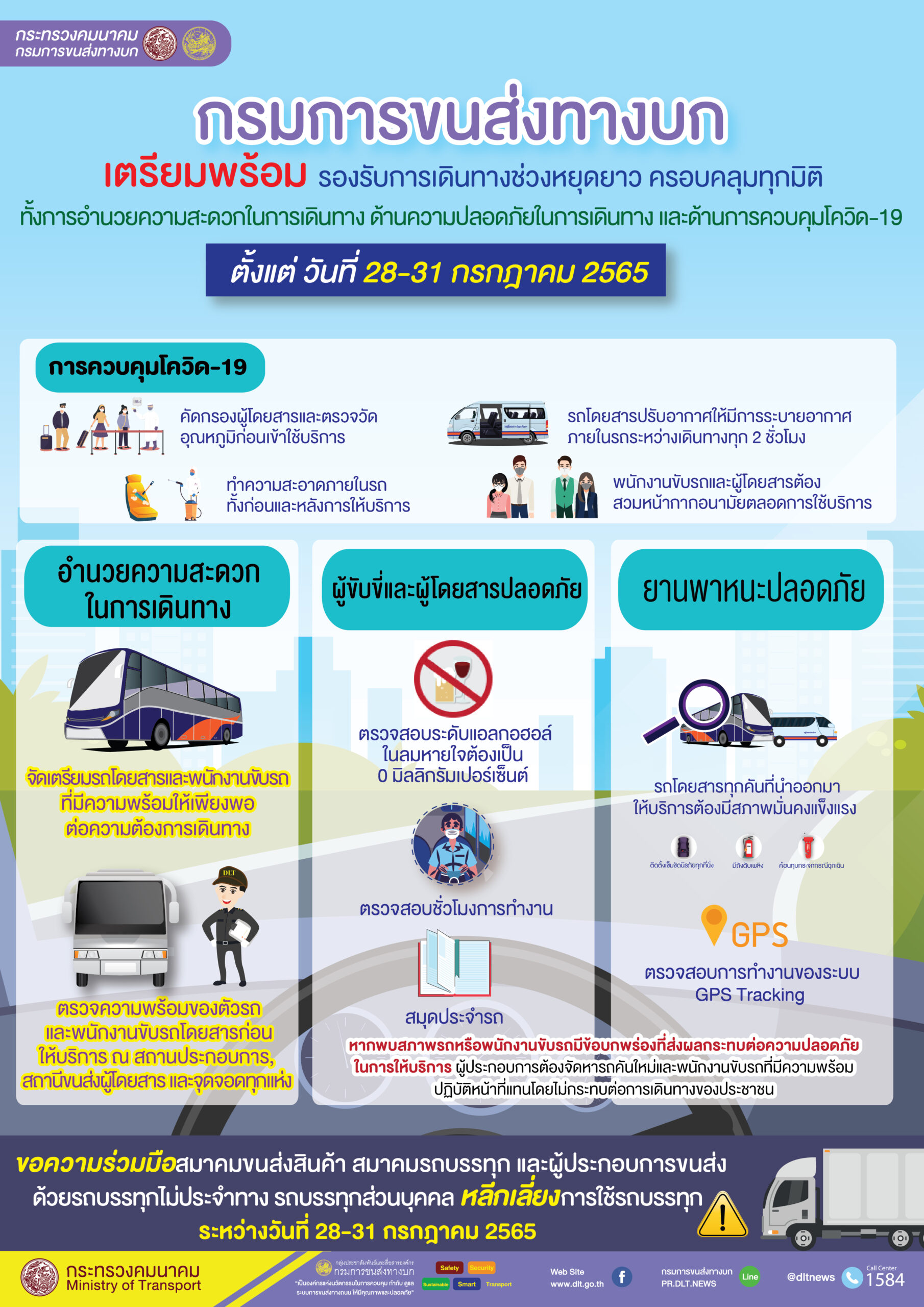 นายจิรุตม์ วิศาลจิตร อธิบดีกรมการขนส่งทางบก เปิดเผยว่า ในช่วงวันหยุดต่อเนื่องวันเฉลิมพระชนมพรรษาพระบาทสมเด็จพระเจ้าอยู่หัว ระหว่างวันที่ 28-31 กรกฎาคม 2565 เป็นอีกช่วงที่คาดว่าจะมีประชาชนออกเดินทางท่องเที่ยวและเดินทางกลับภูมิลำเนาทั่วประเทศเป็นจำนวนมาก นายศักดิ์สยาม ชิดชอบ รัฐมนตรีว่าการกระทรวงคมนาคม ได้สั่งการให้กรมการขนส่งทางบกเตรียมการรองรับการเดินทางของประชาชนตามมาตรการอำนวยความสะดวกและความปลอดภัยเพื่อรองรับการเดินทางของประชาชนให้ครอบคลุมทั้งมิติอำนวยความสะดวกในการเดินทาง มิติความปลอดภัยในการเดินทาง และมิติด้านการควบคุมโควิด-19