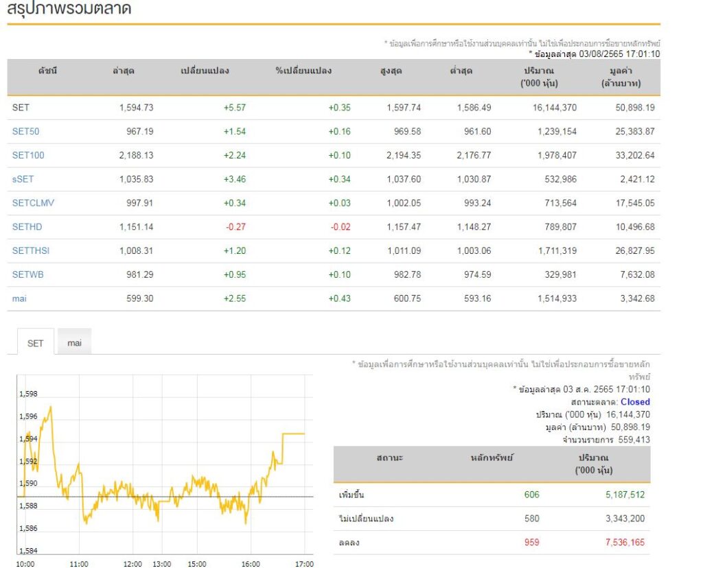 บรรยากาศการลงทุนในตลาดหุ้นไทยตลอดทั้งวันที่ผ่านมา ( 3ส.ค.) ปิดตลาดดัชนีปรับตัวเพิ่มขึ้น 5.57 จุด แตะ 1,594.73 จุด มูลค่าการซื้อขาย 50,898.19 ล้านบาท