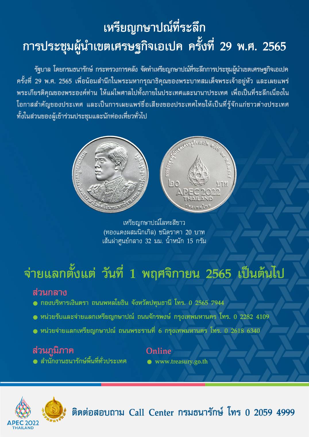 กรมธนารักษ์เปิดจ่ายแลกเหรียญกษาปณ์ที่ระลึกการประชุมผู้นำเขตเศรษฐกิจเอเปค ครั้งที่ 29 พ.ศ. 2565