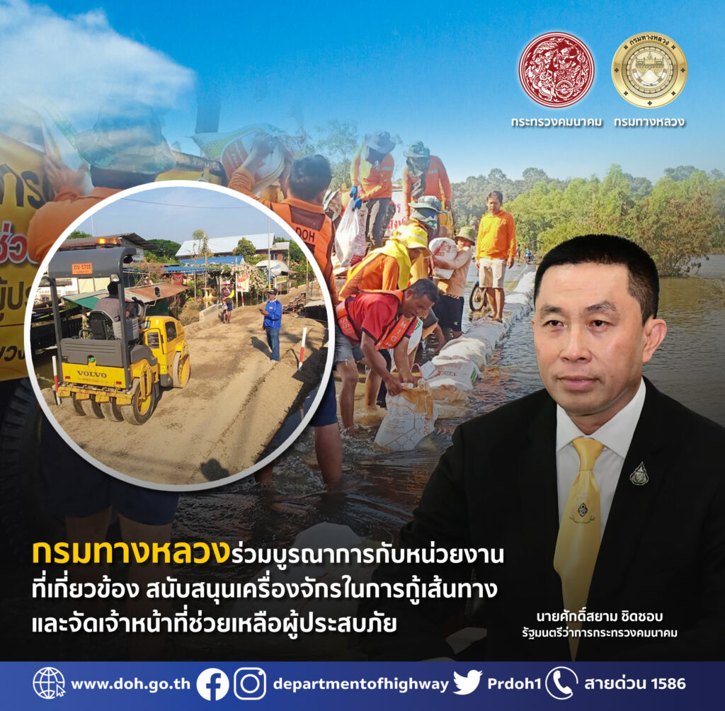 กรมทางหลวงร่วมบูรณาการกับหน่วยงาน สนับสนุนเครื่องจักรในการกู้เส้นทางและจัดเจ้าหน้าที่ช่วยเหลือผู้ประสบภัย