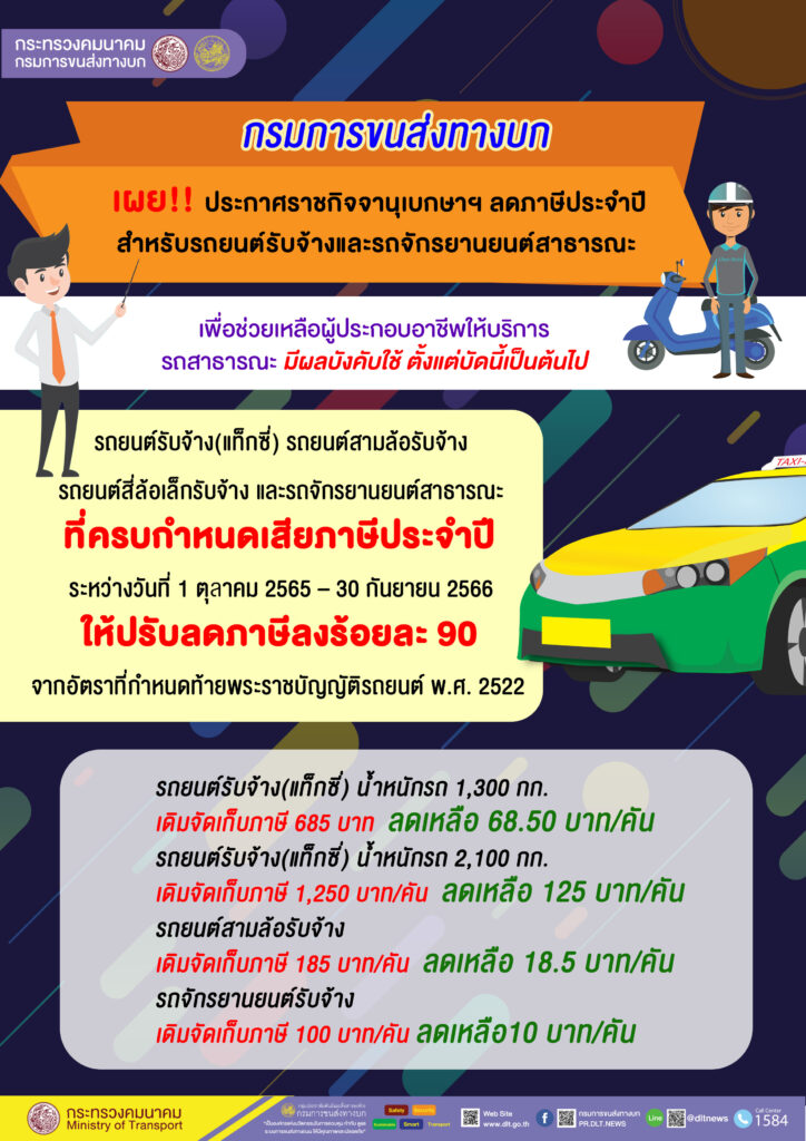 ทั้งนี้ สาระสำคัญของพระราชกฤษฎีกาลดภาษีประจำปีสำหรับรถยนต์รับจ้าง(แท็กซี่) รถยนต์สามล้อรับจ้าง รถยนต์สี่ล้อเล็กรับจ้าง และรถจักรยานยนต์สาธารณะ ที่ครบกำหนดเสียภาษีประจำปี ระหว่างวันที่ 1 ตุลาคม 2565 – 30 กันยายน 2566