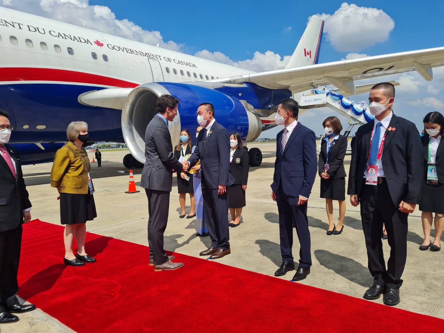 นายศักดิ์สยาม ชิดชอบ รัฐมนตรีว่าการกระทรวงคมนาคม ในฐานะผู้แทนรัฐบาลไทย ให้การต้อนรับ นายจัสติน ทรูโด (The Right Honourable Justin Trudeau) นายกรัฐมนตรีแคนาดา ในโอกาสเดินทางเข้าร่วมการประชุมความร่วมมือทางเศรษฐกิจในเอเชียแปซิฟิก (Asia-Pacific Economic Cooperation: APEC 2022) ระหว่างวันที่ 14 – 19 พฤศจิกายน 2565 ณ ท่าอากาศยานทหาร 2 กองบิน 6 (บน.6) ดอนเมือง กรุงเทพฯ