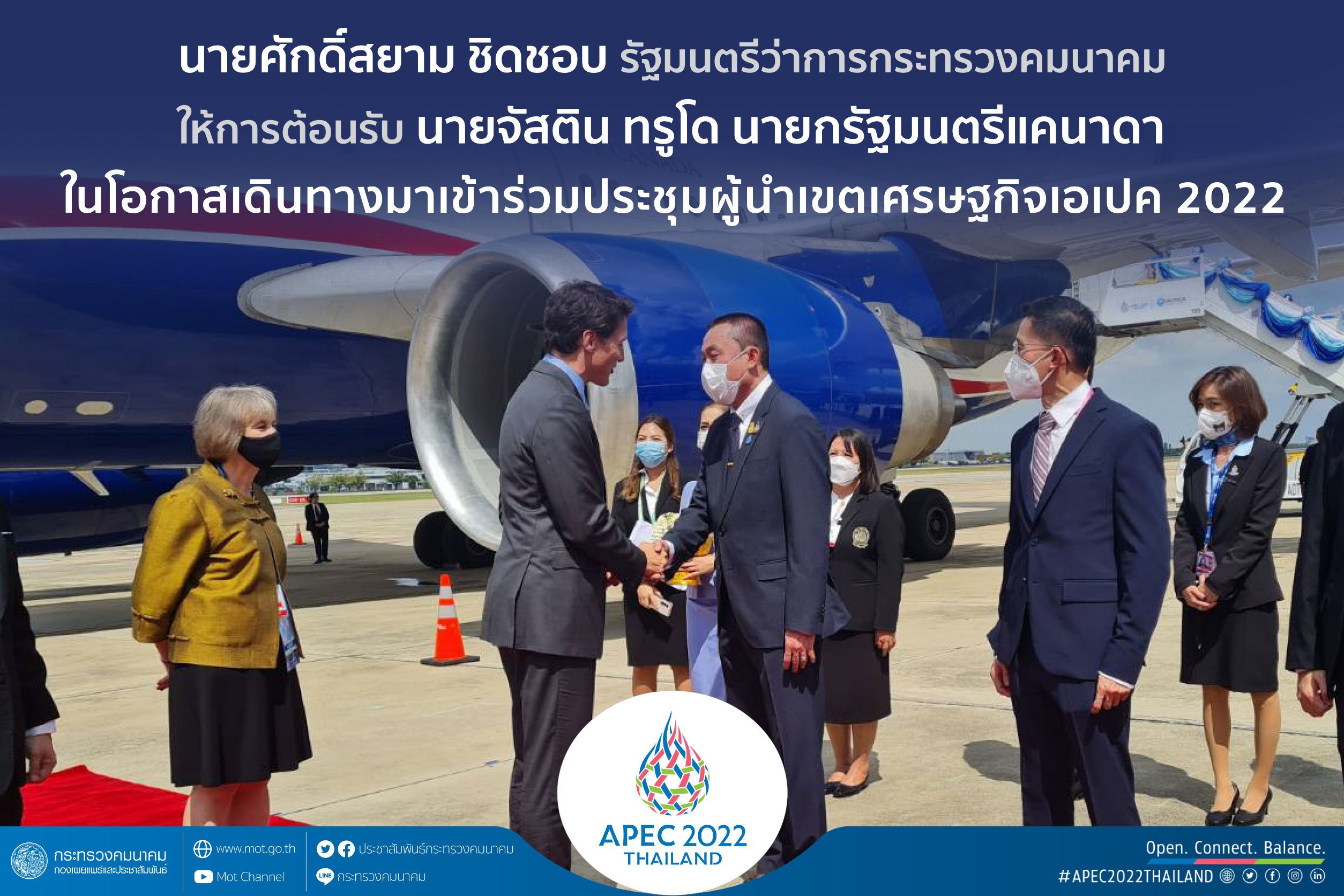 นายศักดิ์สยาม ชิดชอบ รัฐมนตรีว่าการกระทรวงคมนาคม ในฐานะผู้แทนรัฐบาลไทย ให้การต้อนรับ นายจัสติน ทรูโด (The Right Honourable Justin Trudeau) นายกรัฐมนตรีแคนาดา ในโอกาสเดินทางเข้าร่วมการประชุมความร่วมมือทางเศรษฐกิจในเอเชียแปซิฟิก (Asia-Pacific Economic Cooperation: APEC 2022) ระหว่างวันที่ 14 – 19 พฤศจิกายน 2565 ณ ท่าอากาศยานทหาร 2 กองบิน 6 (บน.6) ดอนเมือง กรุงเทพฯ