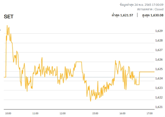 บรรยากาศการลงทุนในตลาดหุ้นไทยตลอดทั้งวันที่ผ่านมา (24 พ.ย.) ปิดตลาดดัชนีปรับตัวเพิ่มขึ้น 0.56 จุด แตะ 1,624.96 จุด มูลค่าการซื้อขาย 45,928.19 ล้านบาท