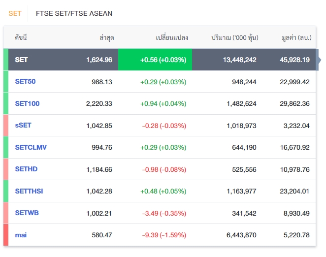 ตลาดหุ้นปิดบวก 0.56 จุด แตะ 1,624.96 จุด มูลค่าการซื้อขาย 45,928.19 ล้านบาท เพิ่มขึ้น 693 หลักทรัพย์