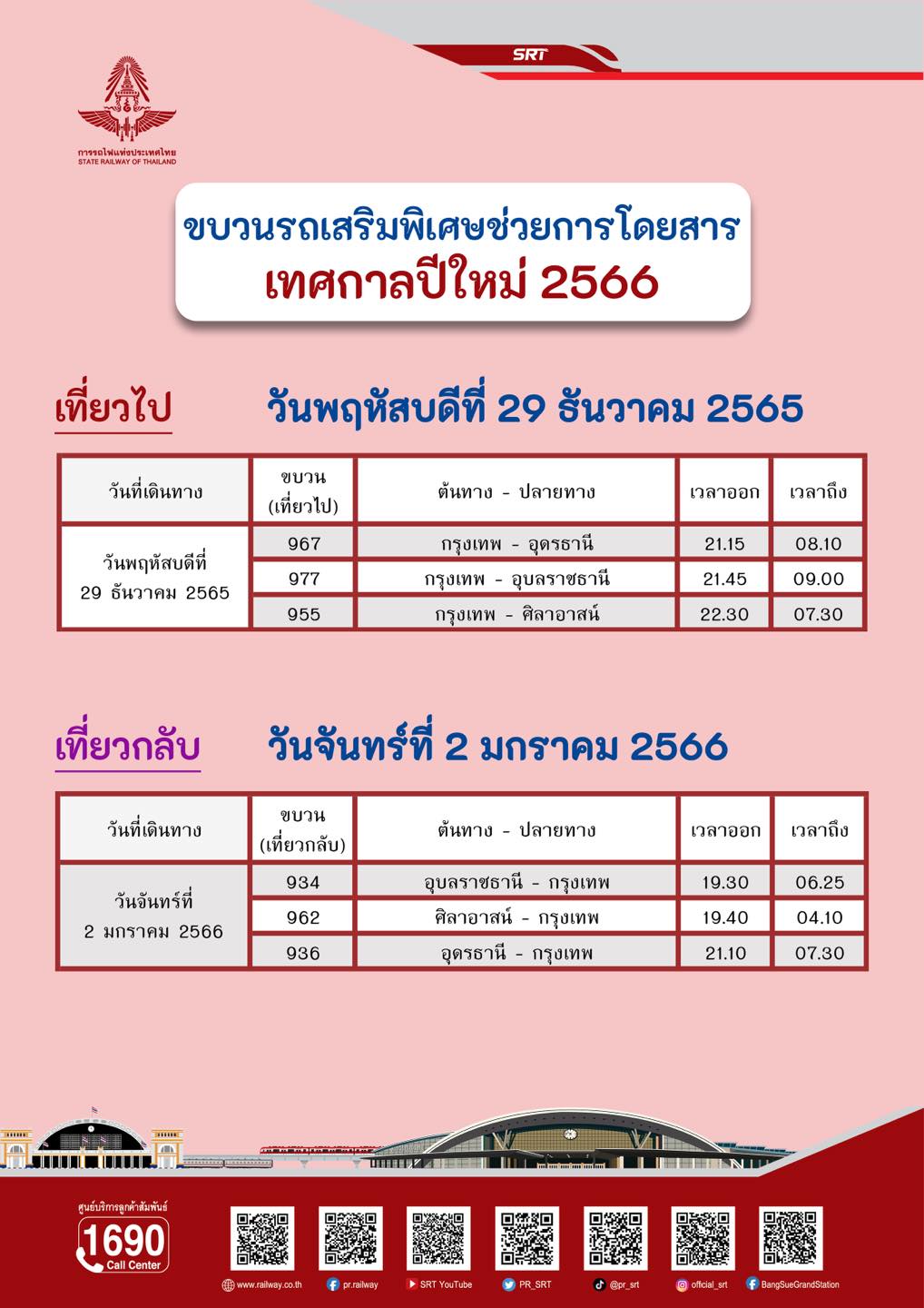 สำหรับขบวนรถพิเศษช่วยการโดยสาร จำนวน 6 ขบวน ประกอบด้วย เที่ยวไป : วันที่ 29 ธันวาคม 2565 จำนวน 3 ขบวน ประกอบด้วย สายเหนือ 1 ขบวน ได้แก่ ขบวนรถที่ 955 กรุงเทพ-ศิลาอาสน์ ออกจากกรุงเทพ เวลา 22.30 น. ถึงเวลา 07.30 น. และสายตะวันออกเฉียงเหนือ 2 ขบวน ได้แก่ ขบวนรถที่ 967 กรุงเทพ-อุดรธานี ออกจากกรุงเทพ เวลา 21.15 น. ถึงเวลา 08.10 น. และขบวนรถที่ 977 กรุงเทพ-อุบลราชธานี ออกจากกรุงเทพ เวลา 21.45 น. ถึงเวลา 09.00 น.