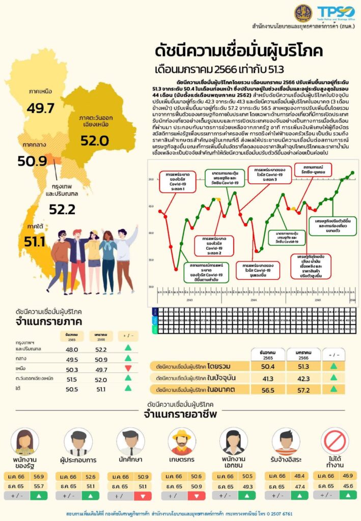นายวิชานัน นิวาตจินดา รองผู้อำนวยการสำนักงานนโยบายและยุทธศาสตร์การค้า กระทรวงพาณิชย์ เปิดเผยว่า ดัชนีความเชื่อมั่นผู้บริโภคโดยรวม เดือนมกราคม 2566 ปรับเพิ่มขึ้นมาอยู่ที่ระดับ 51.3 จากระดับ 50.4 ในเดือนก่อนหน้า อยู่ในช่วงความเชื่อมั่นต่อเนื่องเป็นเดือนที่ 2 และอยู่ระดับสูงสุดในรอบ 44 เดือน เป็นการปรับเพิ่มขึ้นทั้งดัชนีความเชื่อมั่นผู้บริโภคในปัจจุบันและในอนาคต