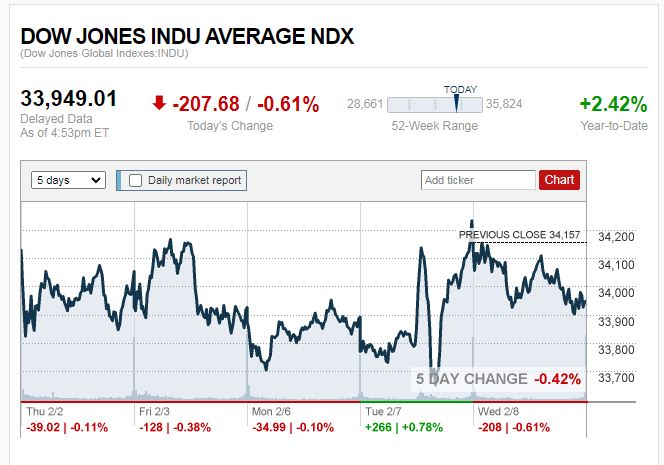 บรรยากาศการลงทุนในตลาดหุ้นสหรัฐเมื่อคืนที่ผ่านมา (8 ก.พ.) ดาวโจนส์ปิดร่วงลง หลังจากเจ้าหน้าที่หลายคนของธนาคารกลางสหรัฐ (เฟด) ออกมาสนับสนุนให้เฟดเดินหน้าปรับขึ้นอัตราดอกเบี้ยต่อไปเพื่อควบคุมเงินเฟ้อ