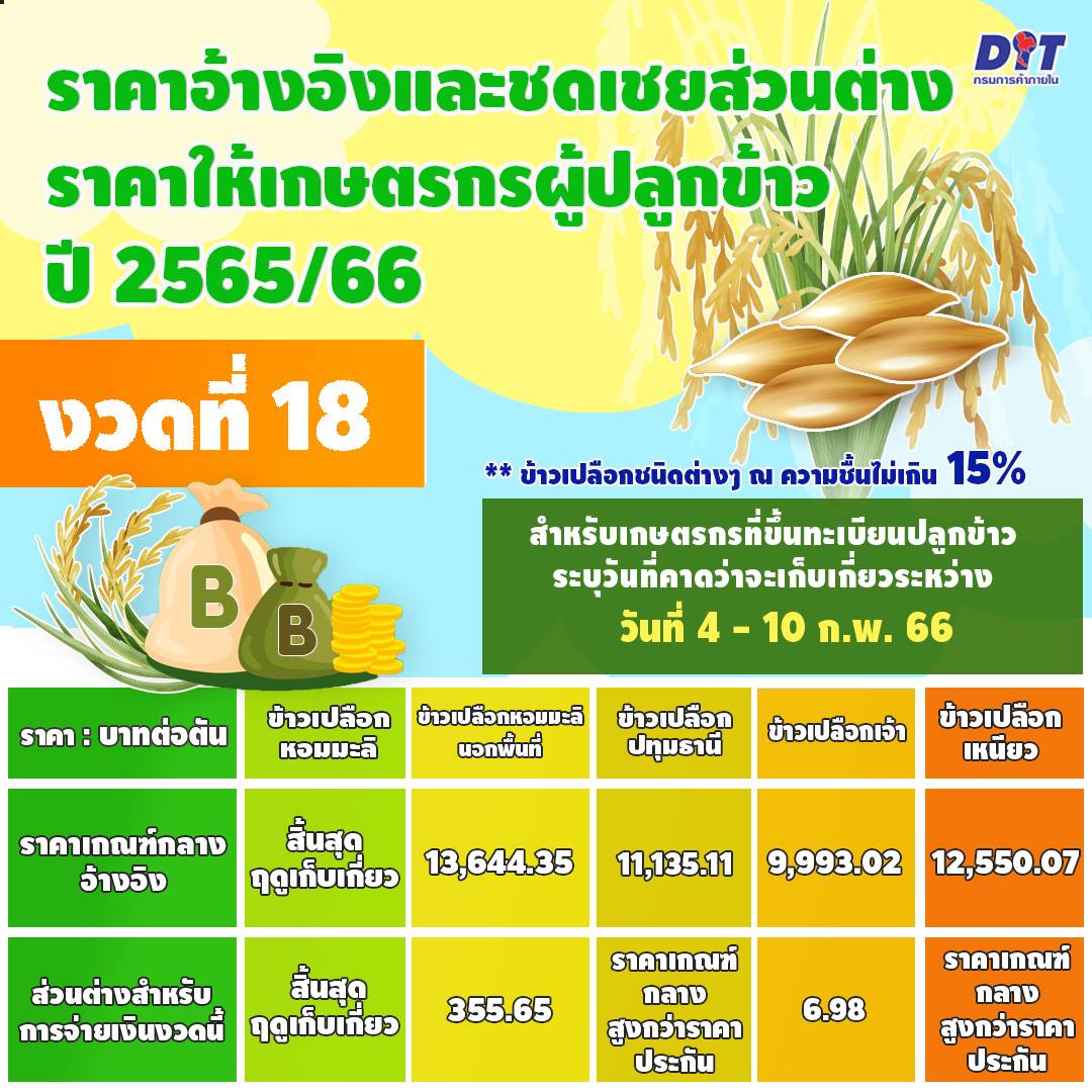 มีราคาเกณฑ์กลางอ้างอิงสูงกว่าราคาประกัน ดังนี้ ข้าวเปลือกปทุมธานี เกณฑ์กลางตันละ 11,135.11 บาท และข้าวเปลือกเหนียว เกณฑ์กลางตันละ 12,550.07 บาท สำหรับข้าวเปลือกหอมมะลิไม่มีราคาเกณฑ์กลางอ้างอิง เนื่องจากสิ้นสุดฤดูเก็บเกี่ยวแล้ว โดยจะจ่ายเงินให้เกษตรกรที่ได้รับสิทธิ์งวดที่ 18 ภายในวันที่ 15 ก.พ.66