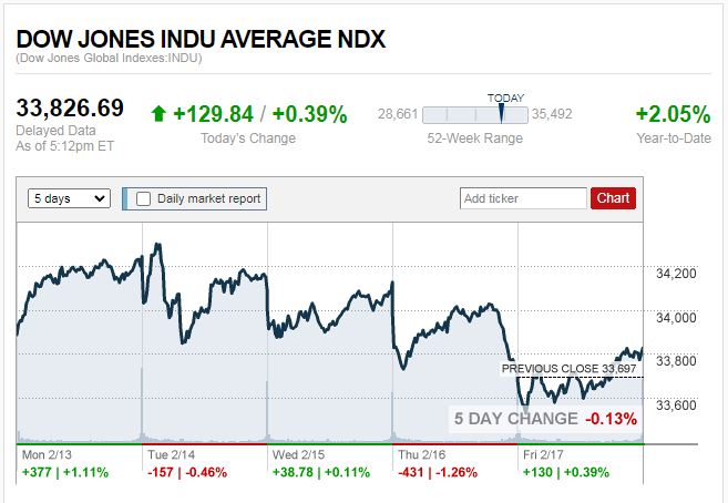 ดาวโจนส์ปิดที่ 33,826.69 จุด เพิ่มขึ้น 129.84 จุด หรือ +0.39%