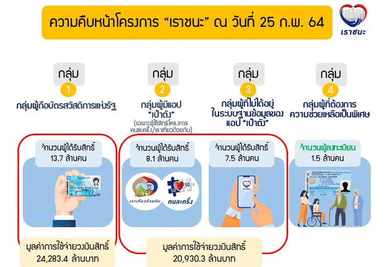 นางสาวกุลยา ตันติเตมิท ผู้อำนวยการสำนักงานเศรษฐกิจการคลัง ในฐานะโฆษกกระทรวงการคลัง เปิดเผยความคืบหน้าของโครงการ เราชนะ ล่าสุด ณ วันที่ 25 กุมภาพันธ์ 2564 ว่า ประชาชนกลุ่มผู้ที่ต้องการความช่วยเหลือเป็นพิเศษได้ลงทะเบียนเข้าร่วมโครงการตั้งแต่วันที่ 15 กุมภาพันธ์ 2564 จนถึงปัจจุบันแล้ว จำนวน 1.5 ล้านคน สำหรับประชาชนกลุ่มผู้ถือบัตรสวัสดิการแห่งรัฐ จำนวน 13.7 ล้านคน ได้มีการใช้จ่ายตั้งแต่วันที่ 5 กุมภาพันธ์ 2564 เป็นต้นมา จำนวน 24,283.4 ล้านบาท สำหรับประชาชนกลุ่มที่อยู่ในระบบฐานข้อมูลของแอปพลิเคชัน “เป๋าตัง” ในโครงการเราเที่ยวด้วยกันและคนละครึ่งและกลุ่มประชาชนทั่วไปที่ลงทะเบียนทางเว็บไซต์ www.เราชนะ .com ที่ผ่านการคัดกรองคุณสมบัติเบื้องต้นและยืนยันการใช้สิทธิ์ร่วมโครงการฯ แล้ว มีจำนวนมากกว่า 15.6 ล้านคน และมีการใช้จ่ายวงเงินสิทธิ์สะสมตั้งแต่วันที่ 18 กุมภาพันธ์ 2564 เป็นต้นมา จำนวน 20,930.3 ล้านบาท รวมมีผู้ใช้สิทธิ์โครงการฯ ทั้งสิ้นจำนวน 29.3 ล้านคน คิดเป็นมูลค่าการใช้จ่ายหมุนเวียนในระบบเศรษฐกิจไทยแล้วกว่า 45,213.7 ล้านบาท ซึ่งเป็นการใช้จ่ายผ่านผู้ประกอบการร้านธงฟ้าราคาประหยัดพัฒนาเศรษฐกิจท้องถิ่นที่มีแอปพลิเคชัน “ถุงเงิน” ร้านค้าคนละครึ่งที่ตกลงยินยอมเข้าร่วมโครงการฯ รวมถึงผู้ประกอบการร้านค้าและผู้ให้บริการรายย่อยที่เข้าร่วมโครงการฯ ที่ลงทะเบียนเข้าร่วมโครงการฯ จำนวนมากกว่า 1.1 ล้านกิจการ โดยภูมิภาคตะวันออกเฉียงเหนือเป็นภูมิภาคที่มีการใช้จ่ายวงเงินสิทธิ์สูงสุดถึงร้อยละ 36 ของการใช้จ่ายวงเงินสิทธิ์รวม ตามมาด้วย กรุงเทพและปริมณฑล ภาคใต้ และภาคกลาง ตามลำดับ