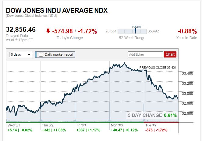 ดาวโจนส์ปิดที่ 32,856.46 จุด ร่วงลง 574.98 จุด หรือ -1.72%
