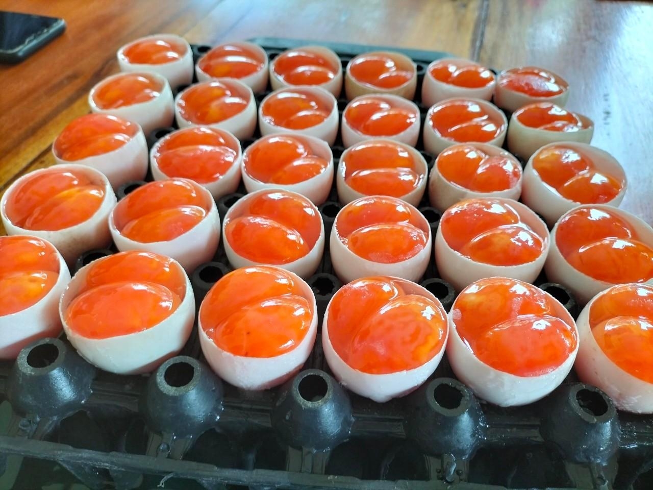 ซึ่งถ่ายทอดจากรุ่นสู่รุ่นมายาวนานกว่า 100 ปี ด้วยการนำไข่แดงจากไข่เป็ดที่เลี้ยงตามมาตรฐานปศุสัตว์มาแช่หรือหยอดน้ำเกลือในปริมาณที่เหมาะสม จากนั้นบรรจุในเปลือกไข่ที่ตัดแต่งขอบแล้ว และครอบฝาด้วยเปลือกไข่ ก่อนนำไปนึ่งจนมีสีแดงอมส้ม ผิวมันวาว เนื้อสัมผัสมี 3 ระดับ คือ เนื้อลาวา เนื้อยางมะตูม และเนื้อดั้งเดิมเหนียวหนึบ รสชาติมันและเค็มเล็กน้อย ไม่มีกลิ่นคาว เป็นอาหารท้องถิ่นที่ได้รับความนิยมสูงและหาทานได้เฉพาะในพื้นที่อำเภอสิงหนคร อำเภอสทิงพระ อำเภอกระแสสินธุ์ และอำเภอระโนด จังหวัดสงขลา