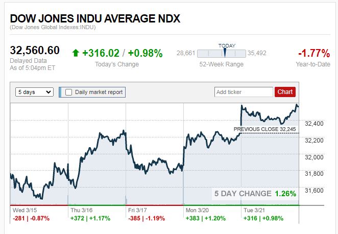 ดาวโจนส์ปิดที่ 32,560.60 จุด พุ่งขึ้น 316.02 จุด หรือ +0.98%