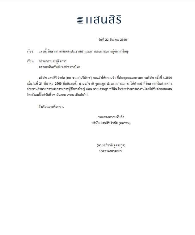 บริษัท แสนสิริ จำกัด (มหาชน) หรือ SIRI แจ้งตลาดหลักทรัพย์แห่งประเทศไทย ว่า ที่ประชุมคณะกรรมการบริษัท ครั้งที่ 4/2566 เมื่อวันที่ 21 มีนาคม 2566 มีมติแต่งตั้ง นายอภิชาติ จูตระกูล ประธานกรรมการ ให้ทำหน้าที่รักษาการในตำแหน่งประธานอำนวยการ และกรรมการผู้จัดการใหญ่ แทน นายเศรษฐา ทวีสิน ในระหว่างการลางานโดยไม่รับค่าตอบแทน โดยมีผลตั้งแต่วันที่ 21 มีนาคม 2566 เป็นต้นไป