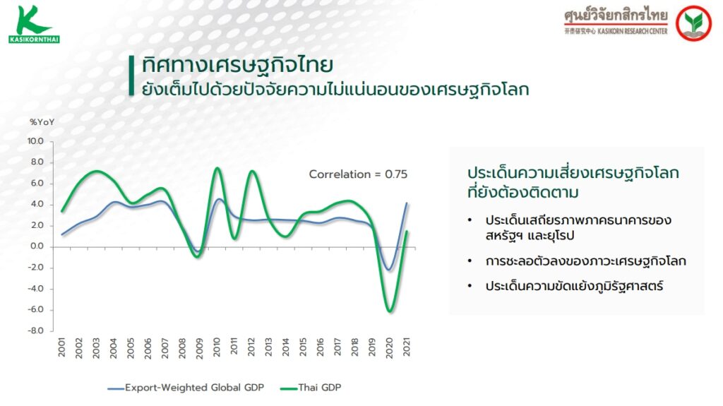 อย่างไรก็ตาม ไทยมีปัจจัยบวกที่ช่วยต้านผลกระทบข้างต้น คือ ภาคการท่องเที่ยว ที่น่าจะเห็นจำนวนนักท่องเที่ยวทั้งปี 2566 ที่อาจสูงกว่าที่คาดไว้เดิมที่ 25.5 ล้านคน มาที่ 28.5 ล้านคน ทำให้ในภาพรวมแล้ว จึงยังคงประมาณการจีดีพีสำหรับทั้งปี 2566 ไว้ที่ 3.7% ทั้งนี้ ทิศทางเศรษฐกิจไทยยังเต็มไปด้วยปัจจัยความไม่แน่นอนของเศรษฐกิจโลก จึงยังเป็นประเด็นที่ยังคงติดตามต่อไป