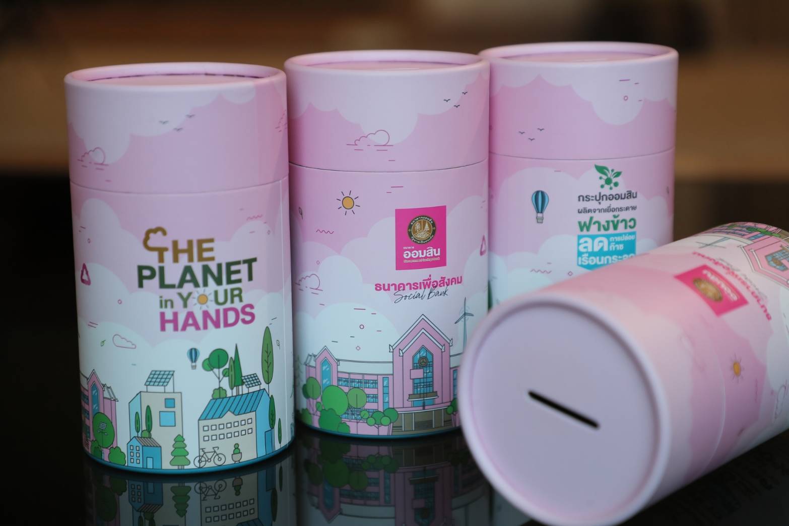 โดยกระปุกออมสินที่จัดทำขึ้นในโอกาสนี้ ผลิตจากเยื่อกระดาษฟางข้าว ซึ่งเป็นวัตถุดิบเหลือใช้จากการเก็บเกี่ยวข้าว มาผลิตเป็นกระปุกออมสินโดยไม่สิ้นเปลืองทรัพยากรใหม่ และลดการเผาฟางข้าวที่ทำลายหน้าดิน โดยตลอดกระบวนการผลิตกระปุกออมสินรักษ์โลก 1 ชิ้น ช่วยลดการปล่อยก๊าซเรือนกระจกได้ 2.5 gCO2e