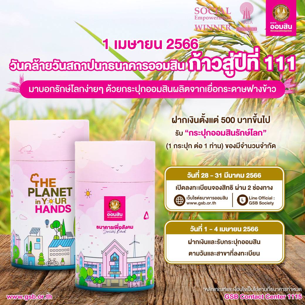 ในโอกาสครบรอบวันสถาปนาธนาคารออมสิน ก้าวสู่ปีที่ 111 ในวันที่ 1 เมษายน 2566 ธนาคารออมสินขอเชิญชวนคนไทยสร้างจิตสำนึกรักการออม โดยผู้ที่ฝากเงินกับธนาคารครบ 500 บาทขึ้นไป มีสิทธิ์รับกระปุก The planet in your hands “กระปุกออมสินรักษ์โลก” เป็นที่ระลึก