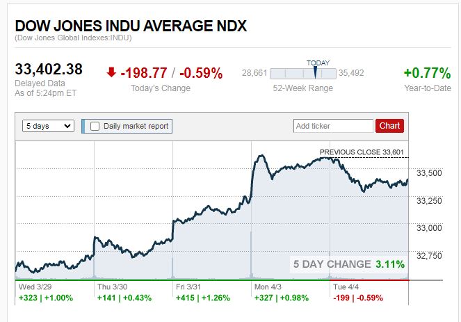 บรรยากาศการลงทุนในตลาดหุ้นสหรัฐเมื่อคืนที่ผ่านมา (4 เม.ย.) ดาวโจนส์ปิดลบ หลังสหรัฐเปิดเผยข้อมูลเศรษฐกิจและแรงงานที่อ่อนแอ ซึ่งทำให้นักลงทุนกังวลว่าการที่ธนาคารกลางสหรัฐ (เฟด) ปรับขึ้นอัตราดอกเบี้ยเชิงรุกเพื่อสกัดเงินเฟ้อในช่วงที่ผ่านมานั้น อาจส่งผลให้เศรษฐกิจเผชิญภาวะถดถอย