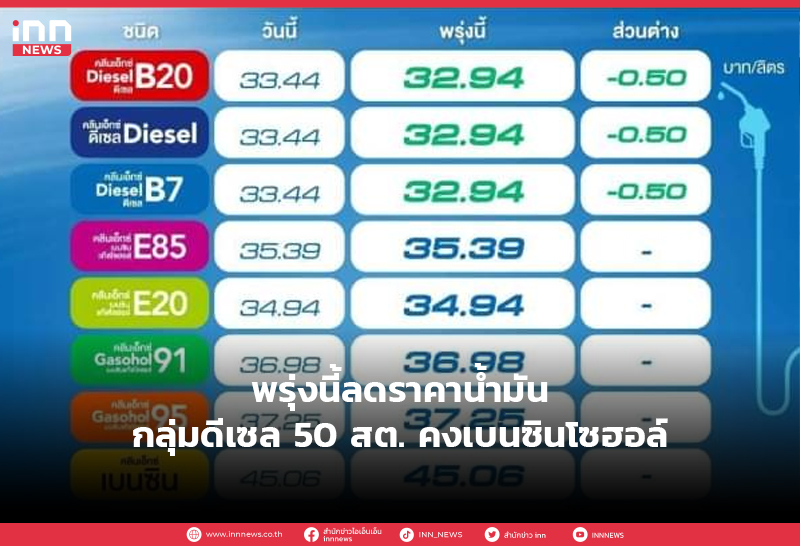 พรุ่งนี้ลดราคาน้ำมันกลุ่มดีเซล 50 สต. คงเบนซินโซฮอล์