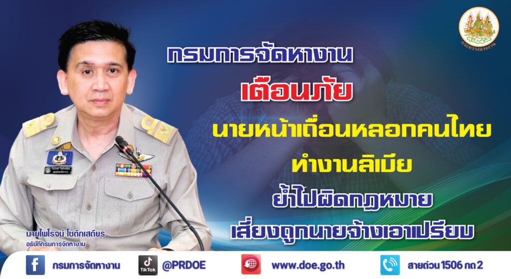 อธิบดีกรมการจัดหางาน เตือนภัยนายหน้าเถื่อนหลอกคนไทยทำงานลิเบีย ย้ำไปผิดกฎหมาย เสี่ยงถูกนายจ้างเอาเปรียบ