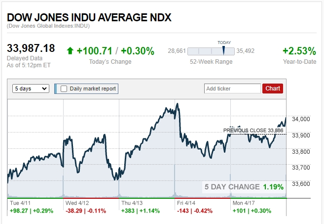 บรรยากาศการลงทุนในตลาดหุ้นสหรัฐ (17 เม.ย.) ดาวโจนส์ปิดบวก โดยได้ปัจจัยหนุนจากแรงซื้อหุ้นกลุ่มการเงินและกลุ่มอุตสาหกรรม ขณะที่นักลงทุนจับตารายงานผลประกอบการของบริษัทจดทะเบียนในสัปดาห์นี้ รวมทั้งการแสดงความเห็นของเจ้าหน้าที่ธนาคารกลางสหรัฐ (เฟด) เพื่อหาสัญญาณที่ชัดเจนมากขึ้นเกี่ยวกับทิศทางอัตราดอกเบี้ยของเฟด