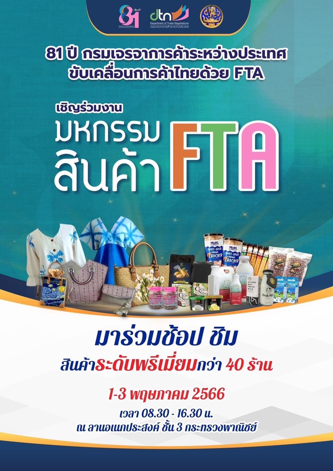 นางอรมน ทรัพย์ทวีธรรม อธิบดีกรมเจรจาการค้าระหว่างประเทศ กระทรวงพาณิชย์ เปิดเผยว่า กรมฯ เตรียมจัดงาน “มหกรรมสินค้า FTA” เนื่องในโอกาสวันคล้ายวันสถาปนากรมเจรจาการค้าระหว่างประเทศ ครบรอบ 81 ปี ระหว่างวันที่ 1-3 พฤษภาคมนี้ ที่ลานอเนกประสงค์ ชั้น 3 กระทรวงพาณิชย์ โดยการจัดงานครั้งนี้ กรมฯได้นำเกษตรกร วิสาหกิจชุมชน