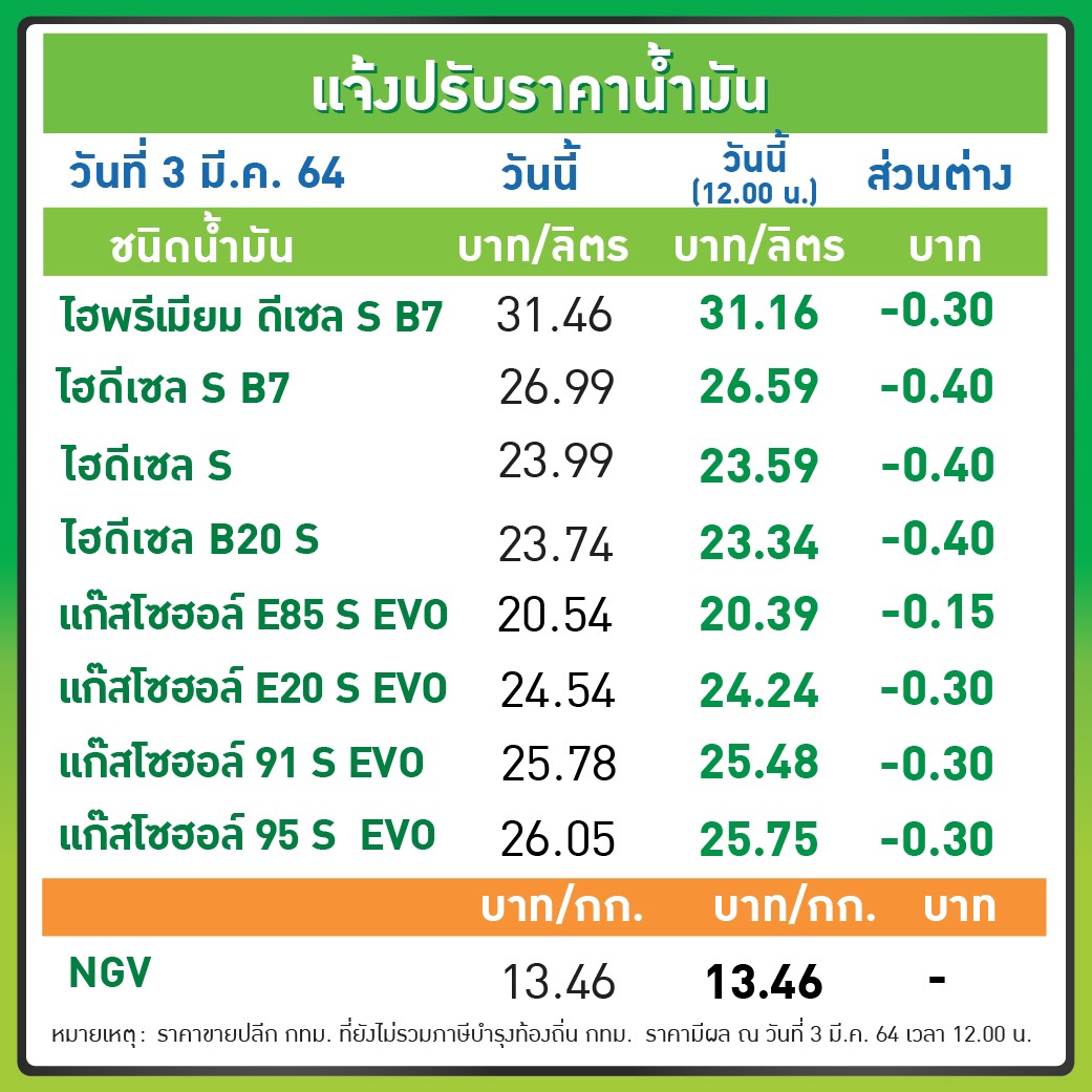 บมจ.ปตท.น้ำมันและการค้าปลีก (OR) ในกลุ่ม บมจ.ปตท. (PTT) และ บมจ.บางจาก คอร์ปอเรชั่น (BCP) ประกาศปรับลงกลุ่มเบนซินและแก๊สโซฮอล์ทุกชนิด 0.30 บาทต่อลิตร เว้นE85 ลดลง 0.15 บาทต่อลิตร ส่วนกลุ่มดีเซลทุกชนิด ลดลง 0.40 บาทต่อลิตร มีผล 3 มี.ค.64 เวลา 12.00 น. เป็นต้นไป