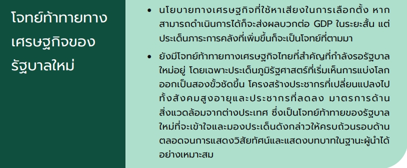 ยังมีโจทย์ท้าทายทางเศรษฐกิจไทยที่สำคัญที่กำลังรอรัฐบาลใหม่อยู่ โดยเฉพาะประเด็นภูมิรัฐศาสตร์ และโครงสร้างประชากรไทยที่เปลี่ยนแปลงไป รวมถึงมาตรการด้านสิ่งแวดล้อมจากต่างประเทศ ซึ่งเป็นโจทย์ท้าทายของรัฐบาลใหม่ที่ต้องอาศัยความเข้าใจและมองประเด็นดังกล่าวได้อย่างครบถ้วนรอบด้าน การวางนโยบายที่ครอบคลุมและแก้ปัญหาอย่างยั่งยืน และคาดหวังที่จะเห็นการแสดงวิสัยทัศน์และแสดงบทบาทของรัฐบาลใหม่ในฐานะผู้นำต่อโจทย์ท้าทายดังกล่าวได้อย่างเหมาะสม