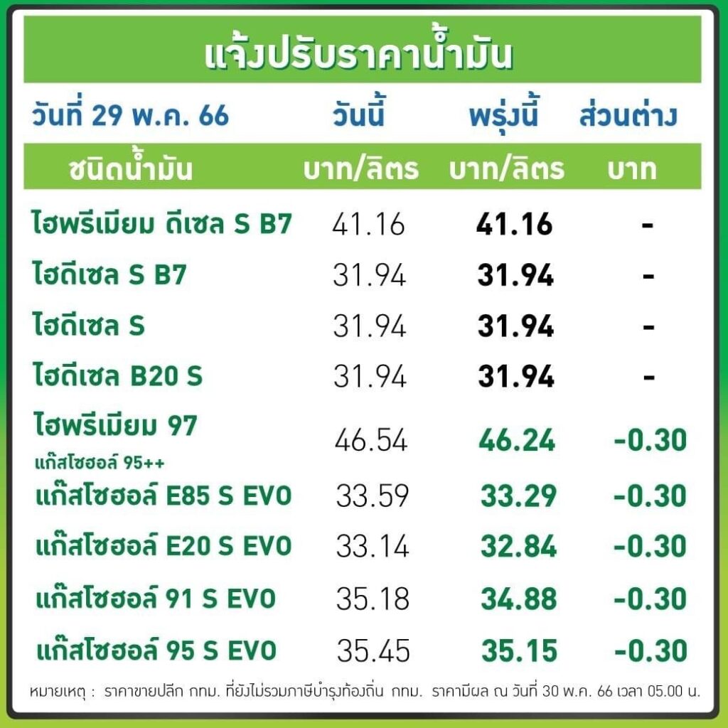 บริษัท ปตท.น้ำมันและการค้าปลีก จำกัด (มหาชน) (OR) และ บริษัท บางจาก คอร์ปอเรชั่น จำกัด (มหาชน) (BCP) ประกาศปรับลดราคาขายปลีกน้ำมันกลุ่มเบนซินและแก๊สโซฮอล์ทุกชนิด 30 ส.ต./ลิตร ส่วนกลุ่มดีเซลคงเดิม มีผล 30 พ.ค.2566 ตั้งแต่เวลา 05.00 น. เป็นต้นไป