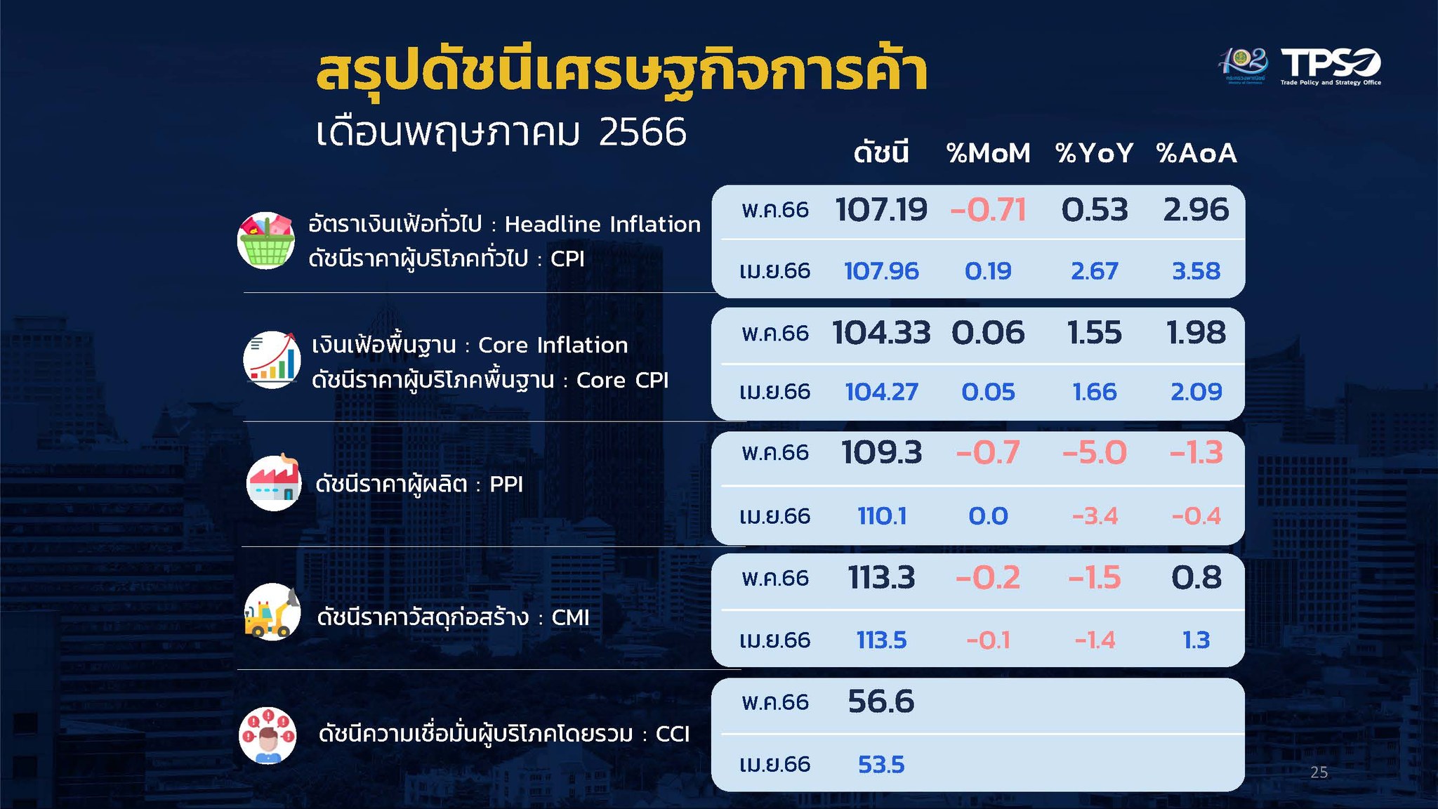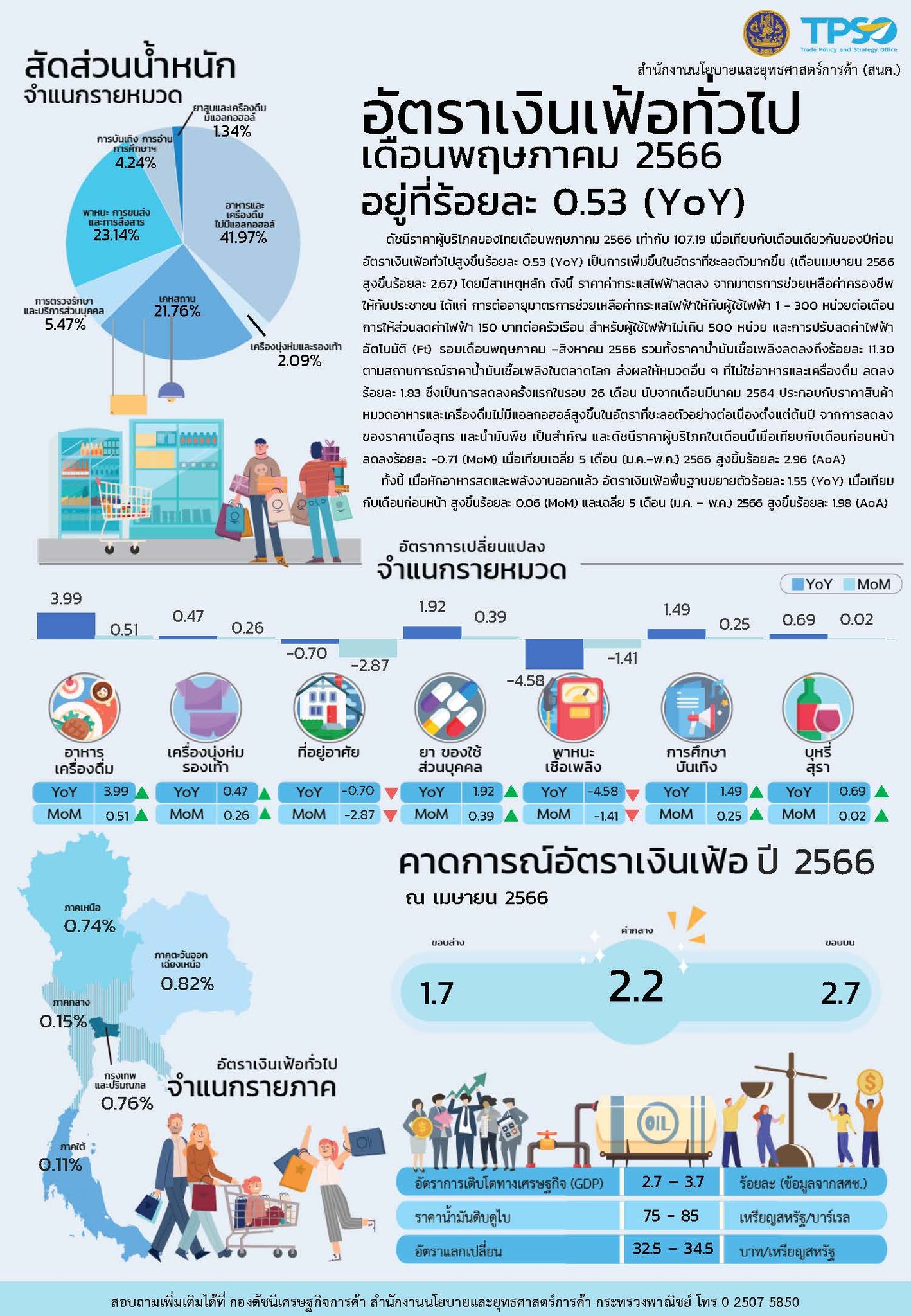 นายวิชานัน นิวาตจินดา รองผู้อำนวยการ สำนักงานนโยบายและยุทธศาสตร์การค้า กระทรวงพาณิชย์ เปิดเผยว่า ดัชนีราคาผู้บริโภคของไทย เดือนพฤษภาคม 2566 เท่ากับ 107.19 เมื่อเทียบกับเดือนเดียวกันของปีก่อน ซึ่งเท่ากับ 106.62 ส่งผลให้อัตราเงินเฟ้อทั่วไป สูงขึ้นเพียงร้อยละ 0.53 (YoY) ชะลอตัวต่อเนื่องเป็นเดือนที่ 5 และต่ำสุดในรอบ 21 เดือน