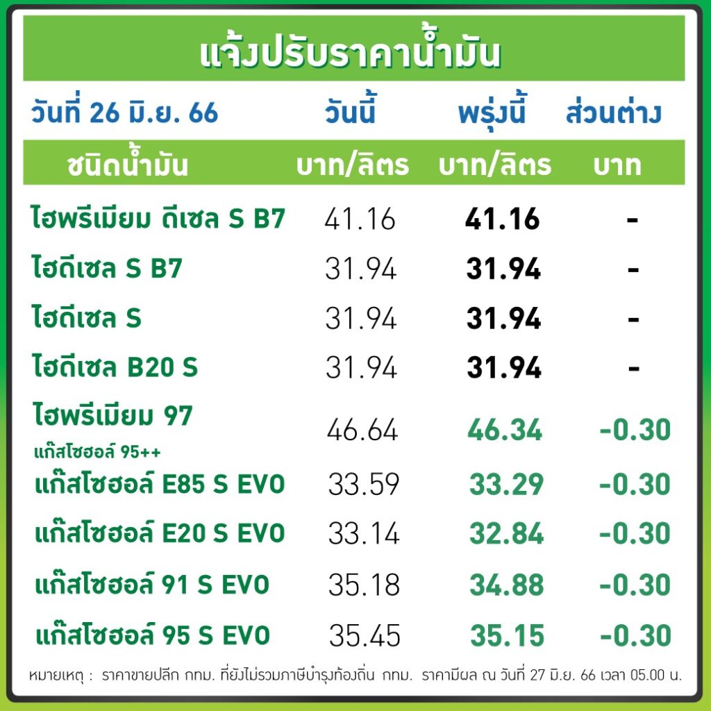 บริษัท ปตท.น้ำมันและการค้าปลีก จำกัด (มหาชน) (OR) และ บริษัท บางจาก คอร์ปอเรชั่น จำกัด (มหาชน) (BCP) ประกาศปรับลดราคาขายปลีกน้ำมันกลุ่มเบนซินและแก๊สโซฮอล์ทุกชนิด 30 ส.ต./ลิตร ส่วนกลุ่มดีเซลคงเดิม มีผล 27 มิ.ย. 2566 ตั้งแต่เวลา 05.00 น. เป็นต้นไป